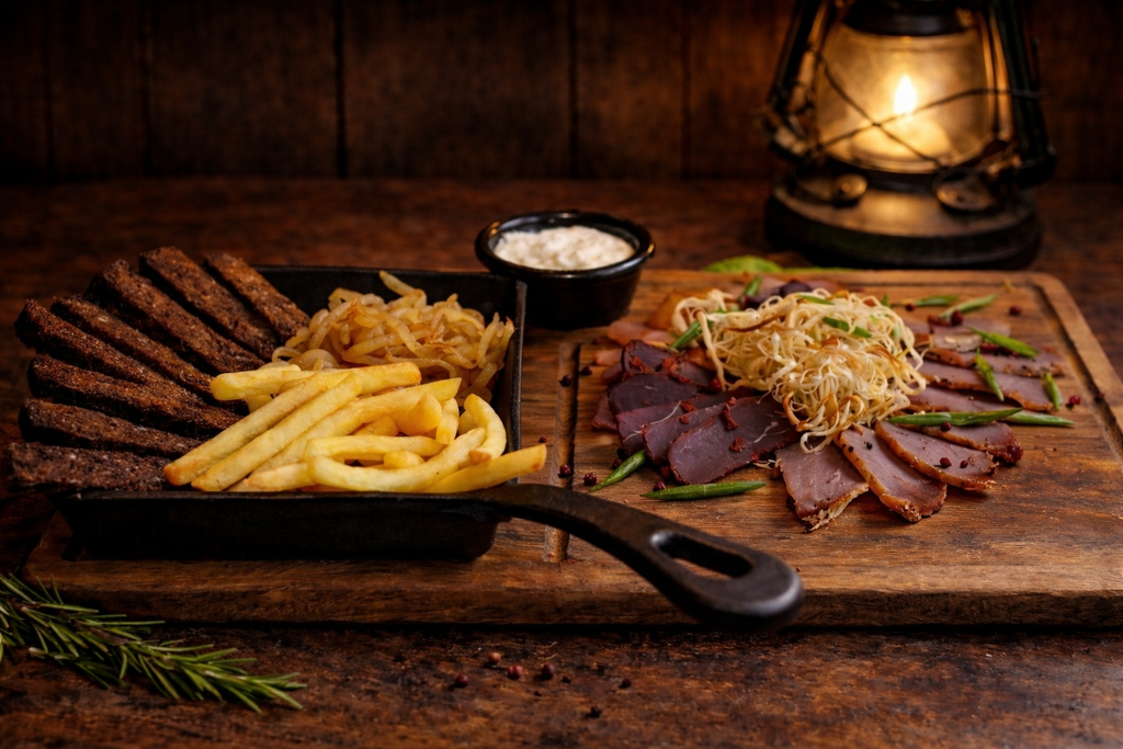 Для компании предлагаем блюда, которые отлично подойдут к пиву: различные виды мяса, сыр Косичка, чесночные гренки, картофель и лук фри. Подается с соусом тар-тар