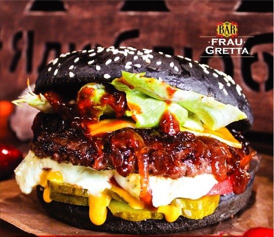 Булка для гамбургера черная, луковый мармелад, котлета говяжья , сыр Чеддер, томаты, огурцы соленые, соус Тартар, горчичный соус, соус BBQ, салат Айсберг.