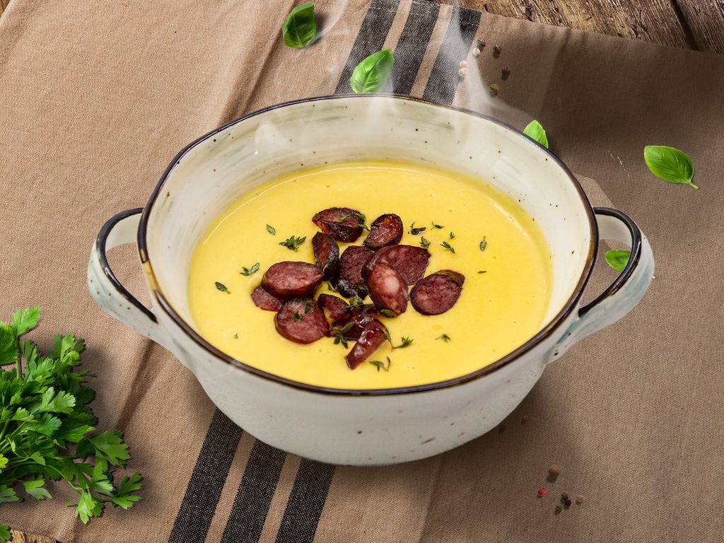 Нежный, сытный, сливочный картофельный суп с копчеными охотничьими колбасками или тигровыми креветками bbq