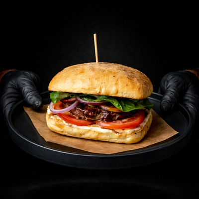 Погрузитесь в мир ярких вкусов с нашим бургером — сочная котлета из мраморной говядины на хрустящей чиабатте, дополненная пикантными соусами айоли и чипотле, свежими томатами, репчатым луком и салатом романо. Этот бургер — настоящее гастрономическое удовольствие для ценителей мясных блюд