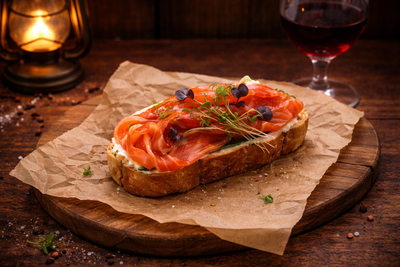 Ищете лёгкий и изысканный вариант закуски? Предлагаем вам попробовать наше блюдо из категории Закуски - идеальное сочетание нежного творожного сыра с зеленью, слабосолёной сёмги и свежего огурца, поданных на ароматной чиабатте