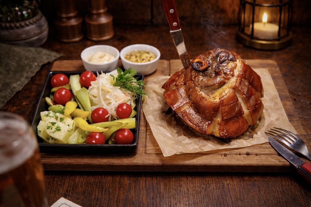 Погрузитесь в мир немецких кулинарных традиций с нашим горячим блюдом — томлёная свиная рулька «Айсбайн» просто тает во рту! Нежный вкус рульки гармонично дополнен квашеной капустой, отварным картофелем и солёными огурцами, а пикантность блюду придают горчица, маринованный перец, маринованные помидоры и хрен. Это сытное и ароматное блюдо не оставит вас равнодушными!